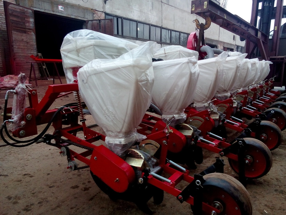 Сеялки СУ-8, предназначені для пунктирного посева калиброванных и некалиброванных отсортированных семян кукурузы, подсолнечника и прочих культур с одновременным внесением минеральных удобрений и прикатыванием почвы в рядках. В сеялке СУ-8 создание разрежения обеспечивается вентилятором ВР-1, установленным на сеялку, приводи мого от ВОМ трактора.Несущий брус рамы сеялки является ресивером ее пневмосистемы. Сеялка СУ-8 агрегатируется с тракторами тяговым усилием от 0,9 до 2 т. Сеялка комплектуется пластиковыми зерновыми и туковыми бункерами.